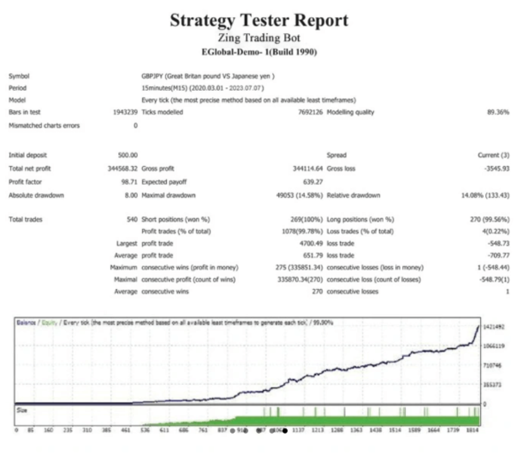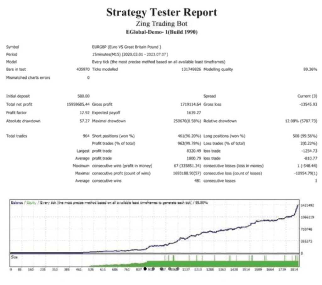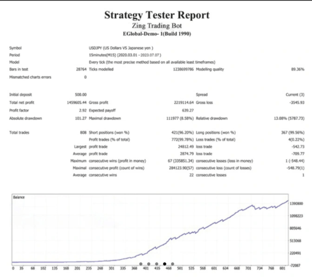 Instead of fixed lot sizes, Zing Trading Bot uses a Fibonacci-based formula. The algorithm automatically reduces size in choppy markets and scales up in stronger trends, aiming to boost returns while capping drawdowns.